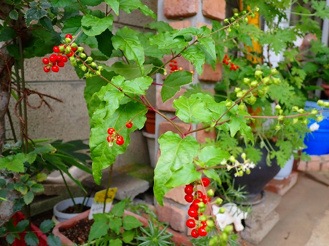ジュズサンゴの赤い実が実り始め、曇天に映えます。