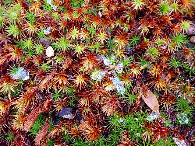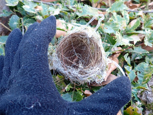 小枝、苔、ビニールテープ、枯葉などが巧みに