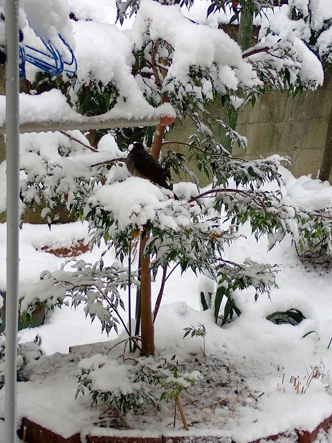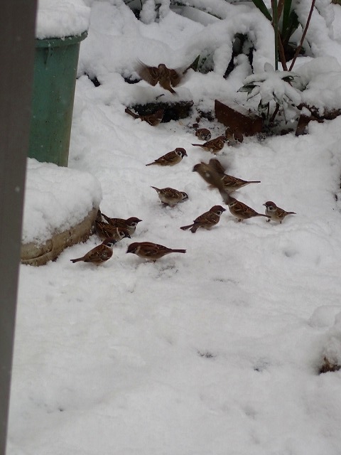 国分寺も大雪。「寒施行」ならぬ「雪施行」。左~~スズメの群れ。