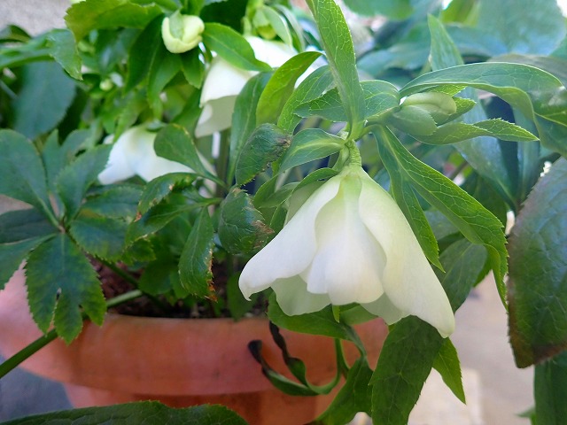 鉢植えの白いクリスマスローズは半日陰のガレージに