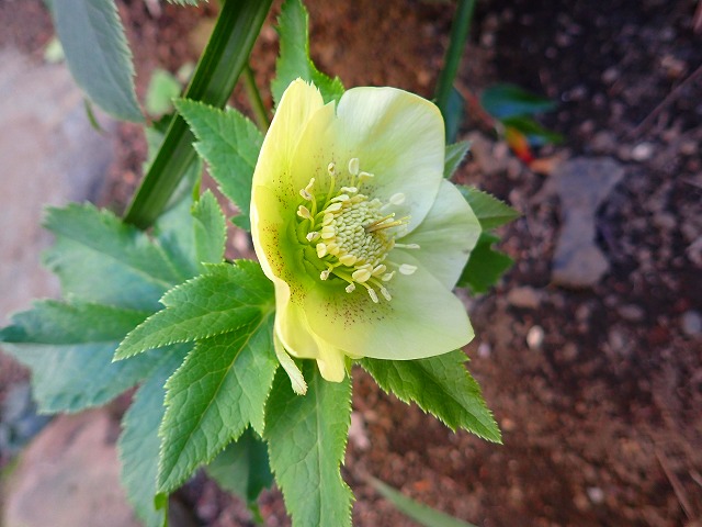 こちらは路地に植えた薄緑色のクリスマスローズ。