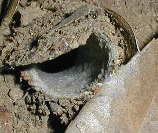 | 2004・9・20 渋谷区 銀糸で裏打ちされた巣.。'05年夏には、タバコの 吸い殻が巣の横に突き刺してあったり、ジュース の空き缶が捨ててあったり。ここは09年2月絶滅状態 |