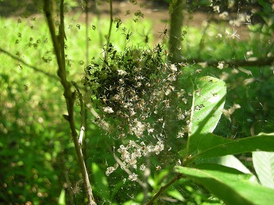 | 2010・6・ 国分寺市東元町3丁目の里山で 孵化してすぐに、一塊になるクモの赤ちゃんです。この状態は 「まどい」と呼ばれます。 |