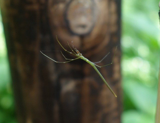オナガグモ (出現期4月〜10月 本州・四国・九州。緑色系と褐色系がいる。簡単な巣を張り、かかるクモを捕食する。体長♀・2〜3センチ ♂・1、2〜2、5センチ)