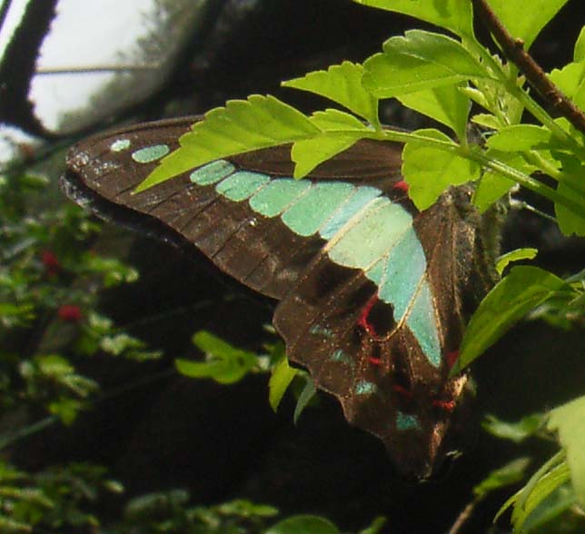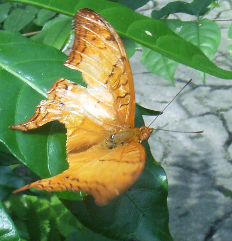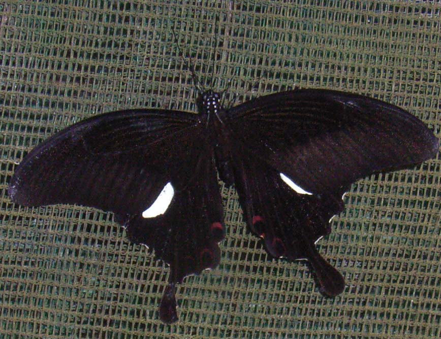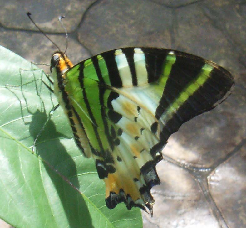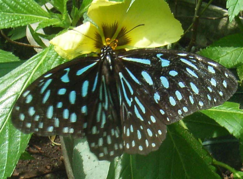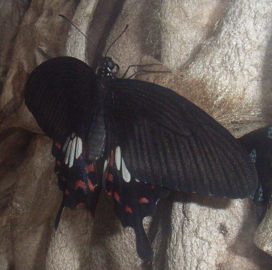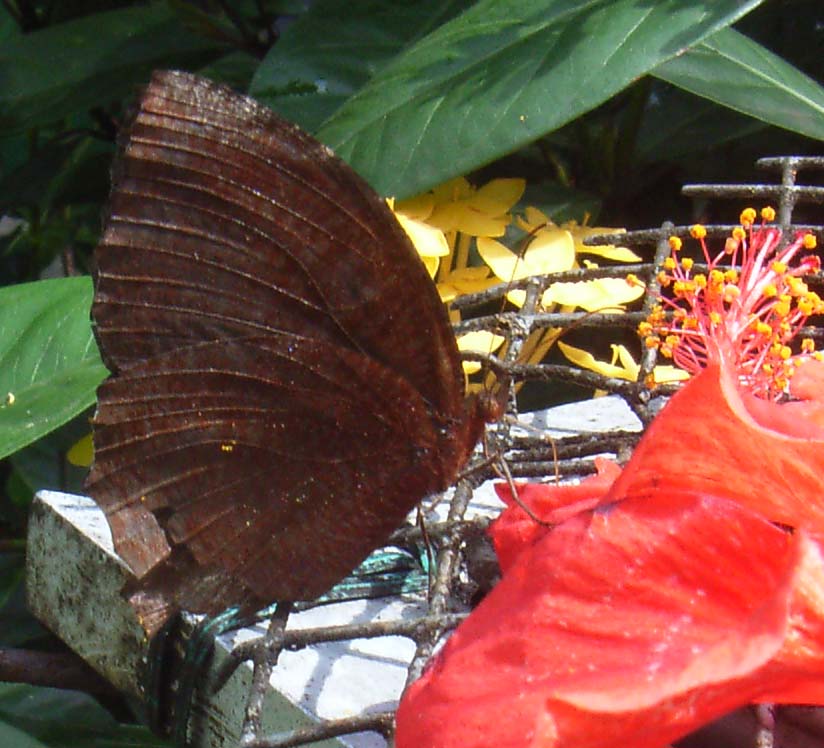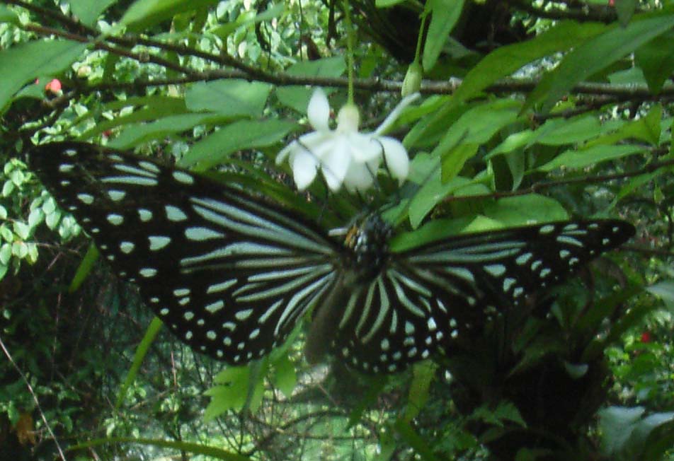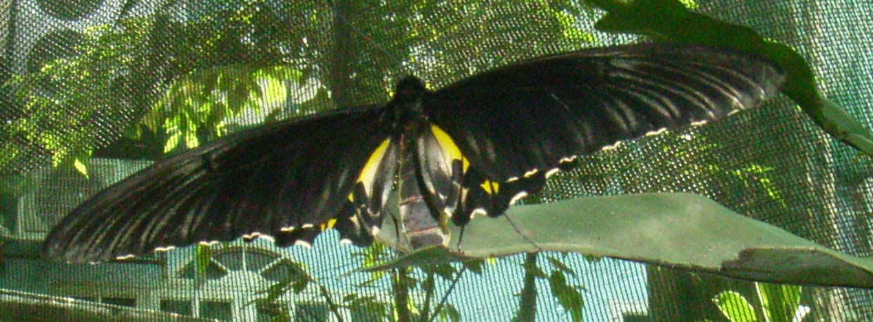 | 「バタフライガーデン」姿形は写真で見たマレーシアの国蝶・アカエリトリバネアゲハに似ているが、模様が違う。もしかすると♀?とも思ったりしたけれど、違うよねー。帰るまでついに国蝶を見ることは出来ず、残念!一日中、遊んでいたい場所のひとつ。 |