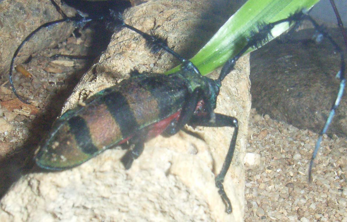 | 2007・3・10 「エレファント・サンクチュアリ」象のエサ場を掃除したあとの水が流れる側溝で。クロゲンゴロウ又はガムシに似ている。背中の中央部がかなり盛り上がっている | 「バタフライガーデン」・モモブトオオルリハムシ 飼育箱の中で光り輝いていました |