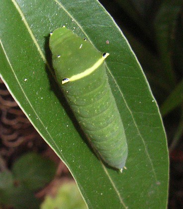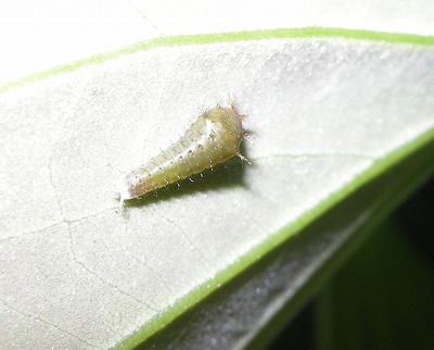 | 2010・10・10 国分寺・自宅 ニッケイの葉裏で。1齢幼虫。葉っぱをハート の形に食べています! |