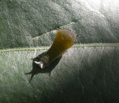 2010・10・10 国分寺・自宅 近くの葉裏では、2齢幼虫も見つけました。身近な庭 で、こうして大きくなっていたんですね! |