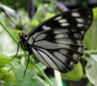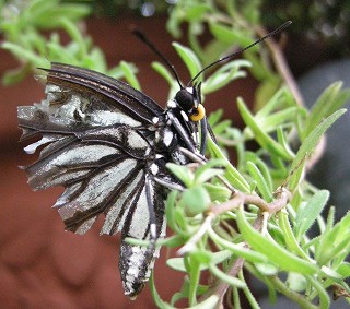 2008・9・16 国分寺市自宅 猫の「ショボ」がくわえてきたチョウ。羽がぼろぼろだったけど、多分、ショボのせいではありません。ショボはセミもバッタも無傷でくわえてくる猫だから。前夜の雷雨のせいでしょう。 |