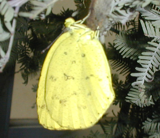 2004・11・6 国分寺市自宅 切ったミモザの枝を花瓶に活けていたら、蛹が ついていたらしい。思いがけない室内での羽化! |