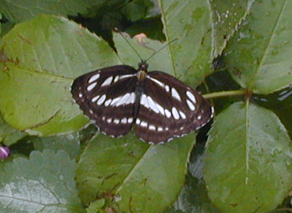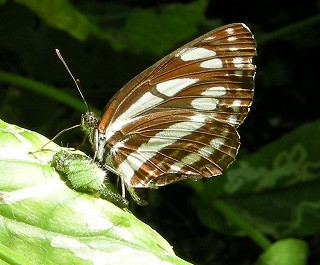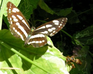 | 2007・5・21 国分寺市自宅・右の画像に続く コミスジがアオムシを狩った右下のハチの様子を うかがっている(葉っぱはムラサキハナナ) |