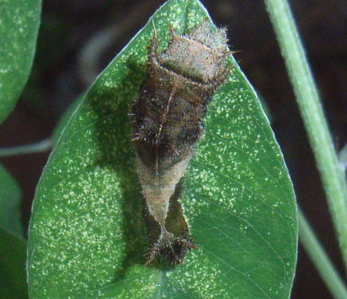 2006・10・2 国分寺・自宅庭・前蛹 雨の日に蛹に。軒下に伸びた雨のかからぬ枝を選んでいる。 |
