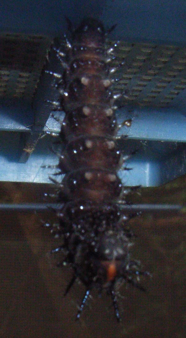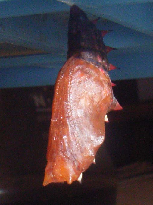 | 2003・11・6 国分寺・自宅 なんと、我が家のガレージの柵で蛹に。友人に手伝って貰い、開閉時の安全を確かめた。見事な場所の選択 |