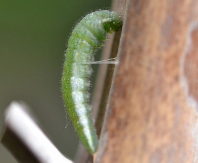 2003・10・20 国分寺市自宅庭 しなった背中がシャチホコのよう。 シダレザクラの小枝で蛹化。 |