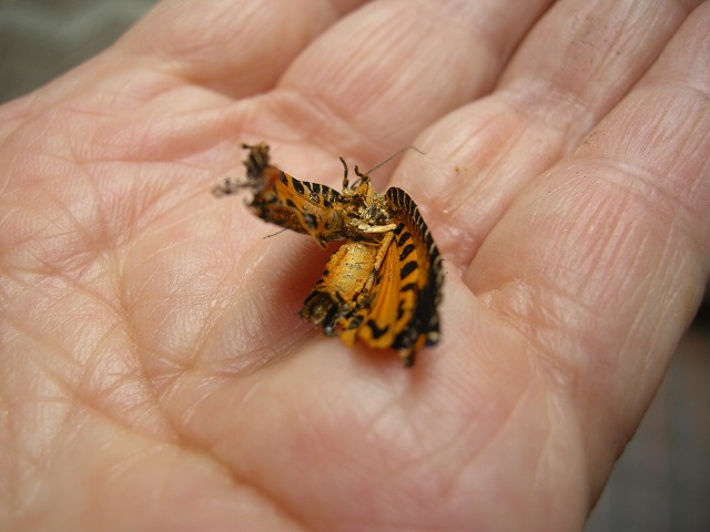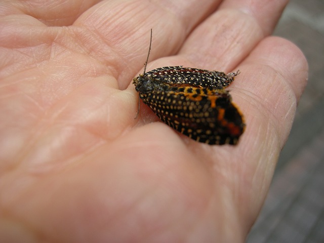 (ハマキガ科 本州、四国、九州に分布 出現期 6〜9月 体長35〜53o。幼虫はシイ、カシなどの広葉樹を食す)