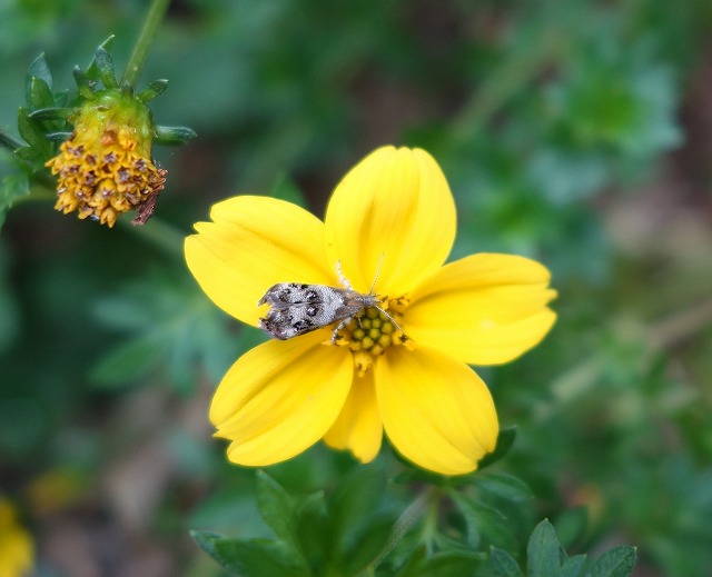 (ゴボウハマキモドキガ科 北海道・本州・四国・九州に分布 出現期は3月〜11月 幼虫の食草はゴボウ、ハハコグサ、シュンギクなど 体長8ミリ前後)