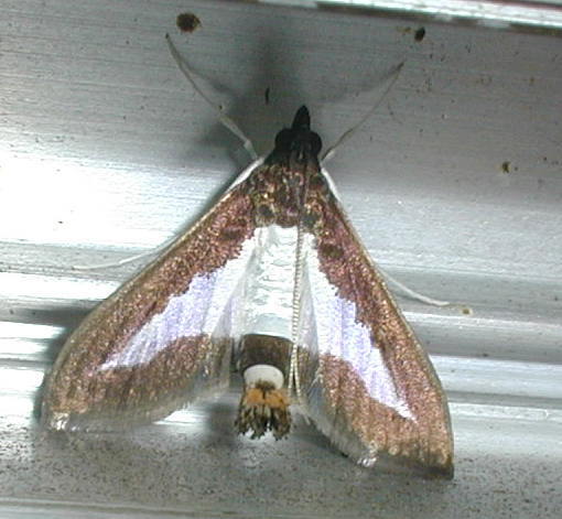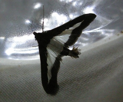 (ツトガ科 開帳約2、5センチ。本州、四国、九州。出現季6月〜11月。幼虫食草・ワタ、クワ、アオイ、ニガウリなど)