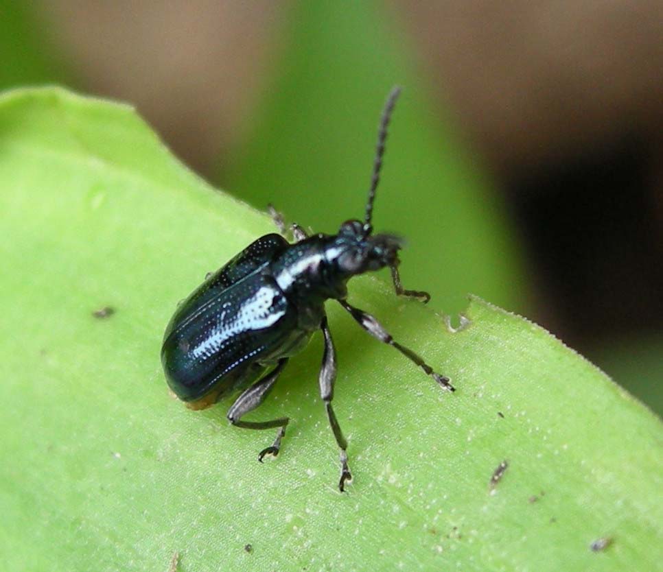 体長約0、7ミリ〜1センチ。食草の「ツユクサ」をかじっている。全身瑠璃色で美しい。
