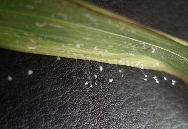 | 2004・5・11 国分寺市・自宅 優曇華(うどんげ)。クリーム色がかっているのは、まだ孵化前。孵化してすぐに餌になるアブラムシの近くに産み付けるのも母の愛 |