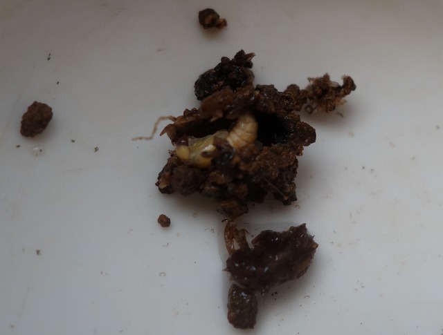 2021・7・10 上陸装置の整理中に転がり出てしまった蛹 蛹室は直径約1、5センチ。土と水苔で作ってある |