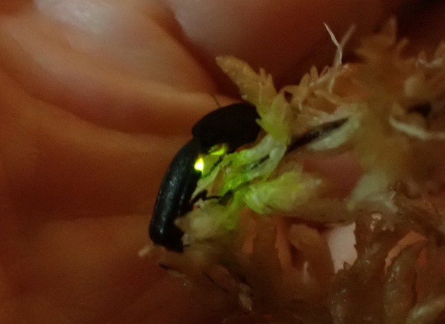 2023・6・12 今年は♀が生まれる確率が高い。蛍は雌雄が 同時に生まれると、すぐに交尾に入る。(光が強い♂が左) |